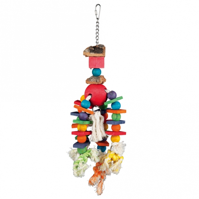 Das Vogelspielzeug besteht aus Holz, Kork und Tau und ist an einer Kette befestigt. Die Naturmaterialien eignen sich ideal zum Spielen und Anknabbern. Es eignet sich z.B. für Nymphen- und Großsittiche.